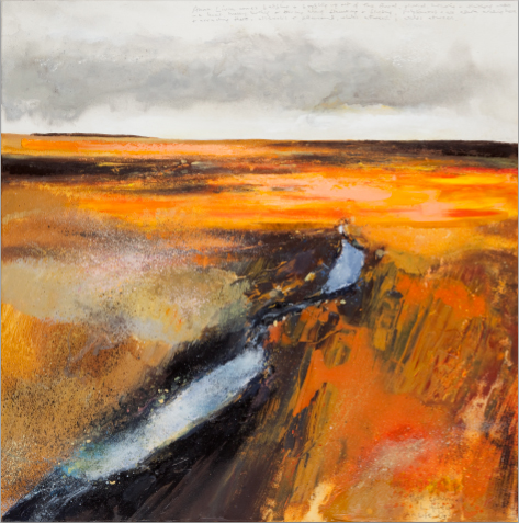 For these are works which, quite apart from the fact that they are largely painted, unusually these days, en plein air, employ vigorous often highly unconventional methods and combinations of materials (Guinness beermats for example) that, between them can go beyond seeming merely visual records, suggesting also a strong sense of performance. You can hear the darkly dripping water seeping out of the peat and falling into the brown amphitheatre of a pool that marks the source of the Liffey and feel the horizontal rain in the face as it whips across a young Liffey in full spate- and sense their urgency for him also in the marginalia with which nearly every work is inscribed and which, more often than not, becomes its title. Like Heaney’s Sweeney Astray, you can imagine Kurt Jackson ’…would live / happy in an ivy bush/ high in some twisted tree/ and never come out’.