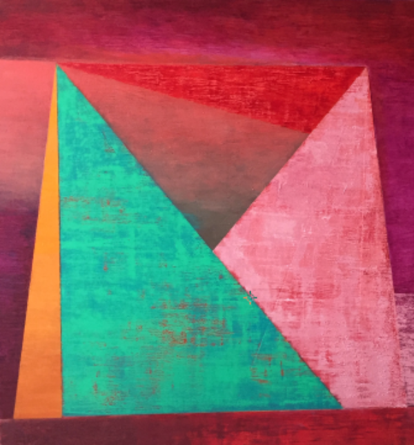 The emotional connection is important, however, it is unrealistic to think that this connection can be made with everybody. I try to entice this sort of response through the creation of a mood in my work which is achieved through the three visual elements of spatial organisation, colour and texture. Abstract art is something that tends to require some conceptual justification. In other words, why have I decided to paint triangles over every other type of subject matter? Firstly I use triangles as a physical incarnation of the eye, hand and heart concept. Secondly, I use the three visual elements of spatial organisation, colour and texture to create a painting. The aim of this painting is for these three visual elements to coexist in harmony to create a visual chord which is pleasing to the eye, in the same way a musical chord of three notes is pleasing to the ear.