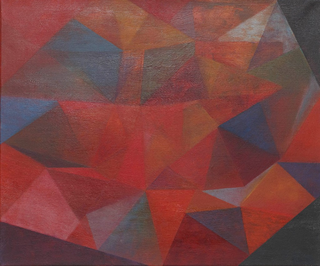 The show is called Triangulation. This simply means the division of a space into triangles, which is what I have done to the surface of the canvas. The term triangulation also refers to something I consider to be a contemporary phenomenon whereby our presence is never fixed but rather alternates between the physical world around us, our internal world and the virtual/ digital world. Our attention is fleeting and triangulates between these three environments in a continuous cycle creating a unique state of consciousness that did not exist until very recently. This new work uses the medium of paint and the language of abstraction to articulate this otherworldly but vaguely familiar environment.