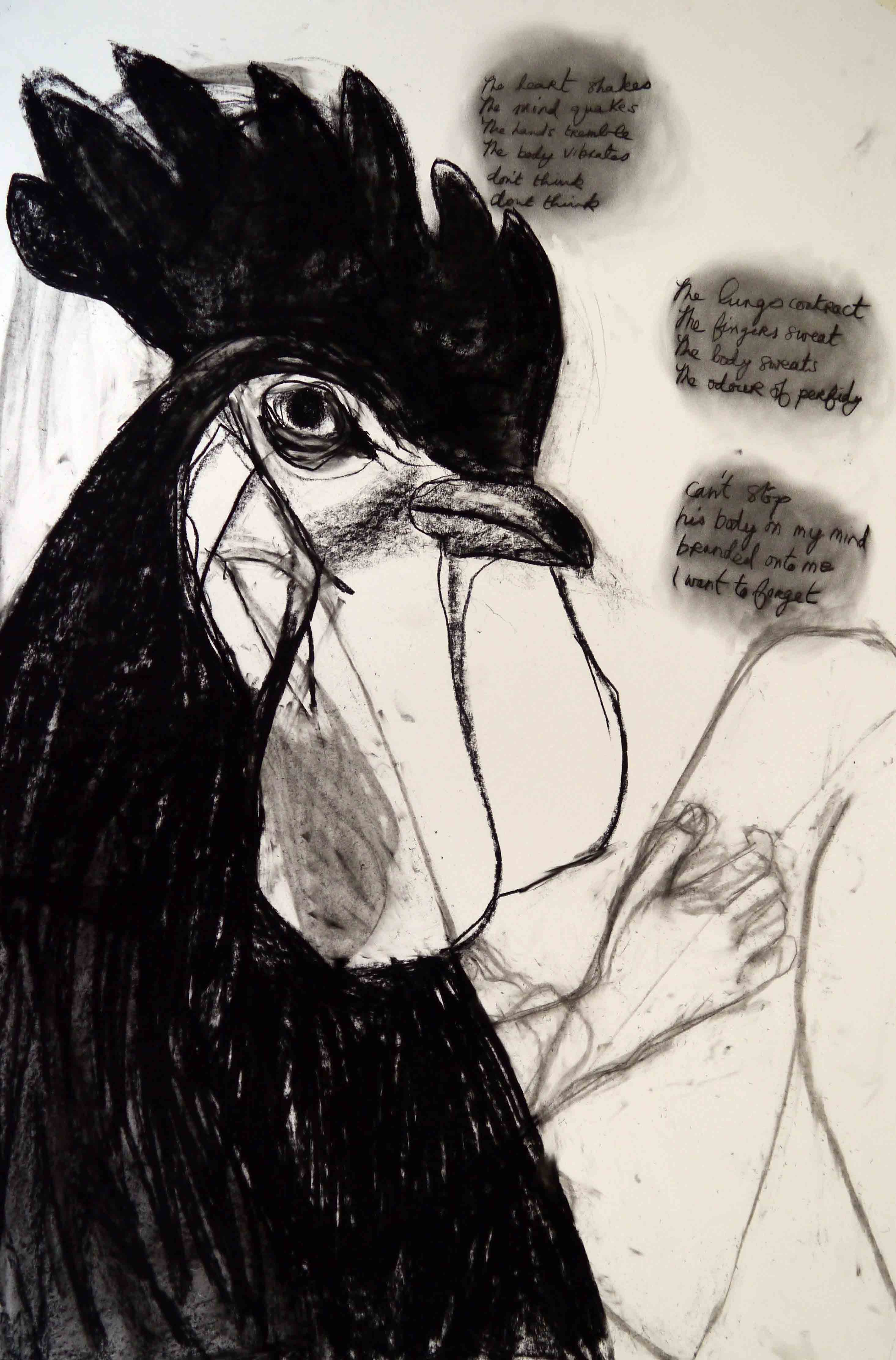 It is a characteristic of this work in particular that all of these bodies; human and animal, are surrounded by thick contour lines that seem to act as a force field or a protective shell. Sometimes these insistent outlines are executed in a vividly contrasting colour, such as the band of pink that separates Harmonie‘s pensive girl from the livid red washed background. In others, such as I Killed a Snake, the gold strip surrounding the figure seems to be an extension of a halo. In all of the works though these protective contours isolate the figures and animals as much as they insulate them. Even in works where more than one presence, human or animal, occupies the space, as in Brain for example – they are remote from each other. Only in drawing, Ecstasy, do two bodies connect – two dogs dissolving into a one charcoal mass, the outlines smeared so that the shapes bleed into the background. For the most part though these bodies are defiantly and assertively separate, contained within an outline at once like a carapace, but also like a cordon sanitaire.